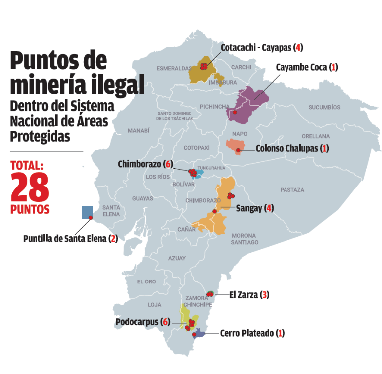 Avanza como un cáncer en el territorio nacional. Hay casi 380 puntos de minería ilegal en el país. Los focos se extienden en el sistema de áreas protegidas. Ya se acercan a 30. En el Parque Nacional Sangay está uno de ellos.