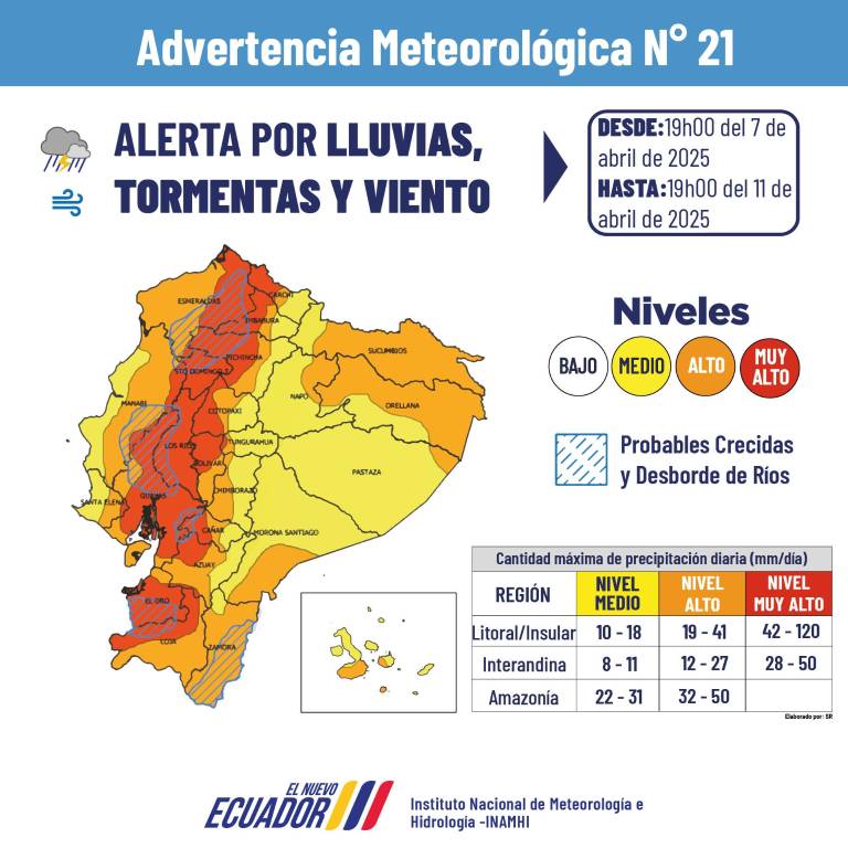 El Instituto Nacional de Meteorología e Hidrología de Ecuador (INAMHI) elevó una alerta con respecto a lluvias intensas con tormentas que, de acuerdo a sus pronósticos, se presentarán en gran parte del país, con mayor énfasis en la región Litoral, entre el 7 al 11 de abril.
