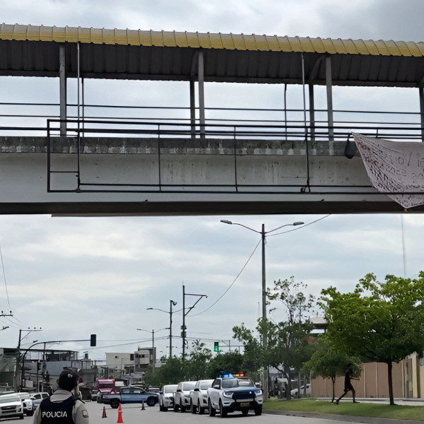 Machala amaneció con una escena digna de una película de terror, aunque no tan sorprendente para el contexto de violencia que asecha al país: dos fundas negras colgadas desde un puente peatonal sobre la avenida Bolívar Madero Vargas, en la vía a Puerto Bolívar, contenían restos humanos. La imagen, acompañada de un mensaje criminal escrito en una sábana blanca, causó pánico entre conductores y transeúntes que dieron aviso inmediato al ECU 911.