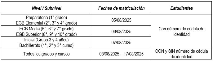 La cartera de Estado informó que, en las direcciones distritales se habilitarán operadores telefónicos para brindar asistencia a los ciudadanos durante el proceso. El cronograma de matrículas ordinarias será de acuerdo con el nivel y subnivel educativo: