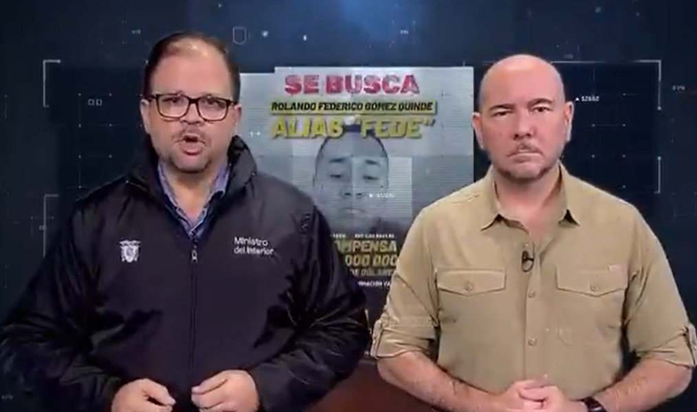 A través de un video, el ministro del Interior, Gian Carlo Loffredo, dijo que el Gobierno "ofrece una recompensa de un millón de dólares a quien entregue información verificada que permita la ubicación y captura de alias 'Fede', uno de los criminales más buscados y peligrosos de Ecuador".