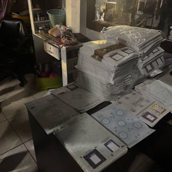 El ministro compartió fotografías del operativo, en las que se aprecian resmas de documentos firmados con distintos sellos, acumuladas en el suelo mientras policías se aprestan a decomisarlas.