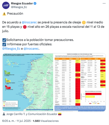 El Instituto Oceanográfico de la Armada (INOCAR) ha emitido un aviso urgente: entre el viernes 11 y el domingo 13 de julio, se espera un periodo de oleaje intenso acompañado de aguaje en las playas de la costa ecuatoriana.
