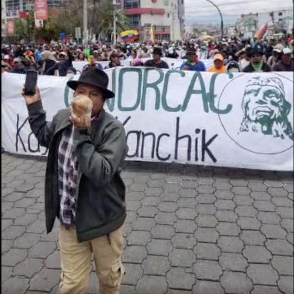 La Unión de Organizaciones Campesinas Indígenas de Cotacachi (UNORCAC) lidera la protesta con carteles, consignas y banderas.