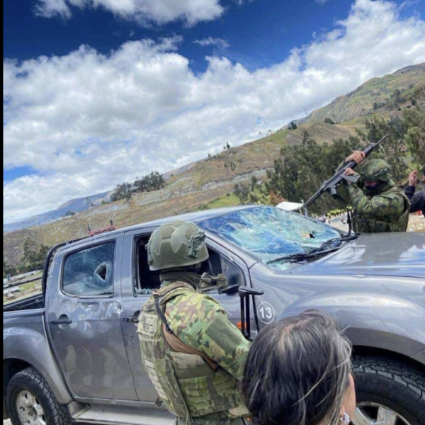 Sin embargo, tras el atentado contra el presidente, empezó a circular en redes sociales una foto en la que aparece un militar rompiendo el parabrisas de una de las camionetas atacadas en Cañar.