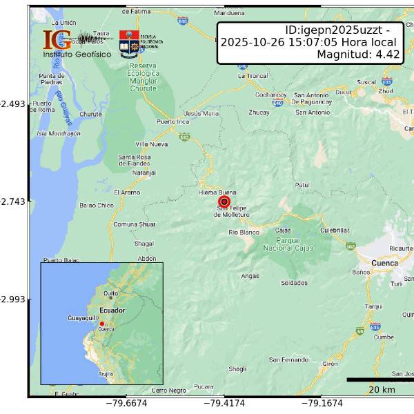 El Instituto Geofísico reportó un sismo de 4.4 grados de magnitud la tarde de este domingo 26 de octubre del 2025 en la provincia del Azuay.