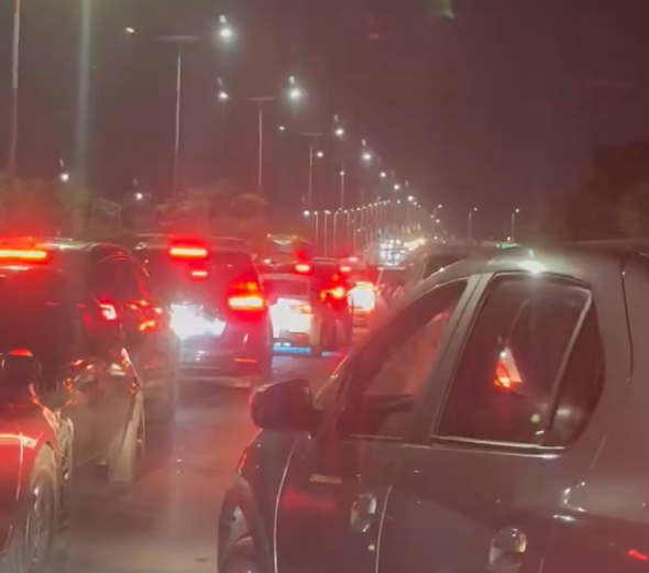 Videos difundidos en redes sociales muestran una congestión vehicular en dirección hacia La Puntilla. El tráfico permanece detenido debido a una alta carga de vehículos, especialmente en un tramo ubicado unos 500 metros antes del puente que conecta con el sector de Sauces 4, donde se concentra el acceso a urbanizaciones.