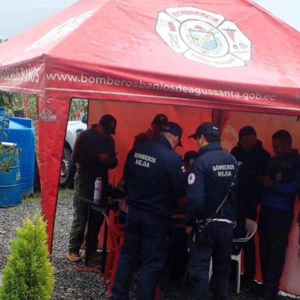 Al rescate se unieron bomberos de Baños, Mejía, Ambato y Quito. También participan agentes de la Policía Nacional y Ejército con drones y perros amaestrados.