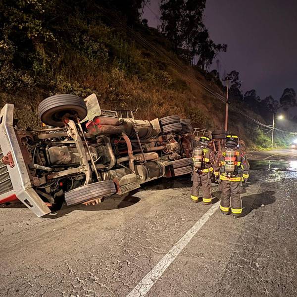 Los Bomberos de Quito informaron que tras el volcamiento del vehículo pesado que transportaba brea, su Unidad de Materiales Peligrosos realizó la contención del derrame, para evitar que pase al carril contrario.