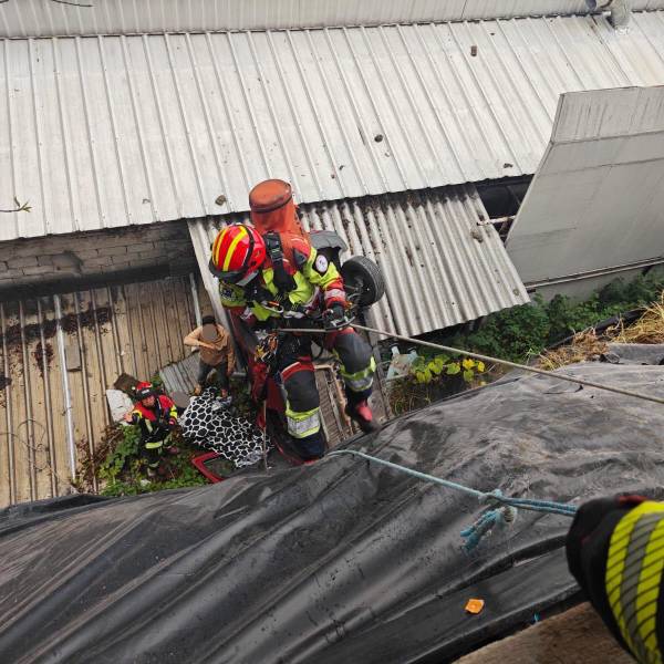 En las imágenes captadas durante el rescate se observa a un uniformado descender con una cuerda hasta el vehículo, que permanecía volcado en lo que aparenta ser el patio de la vivienda.