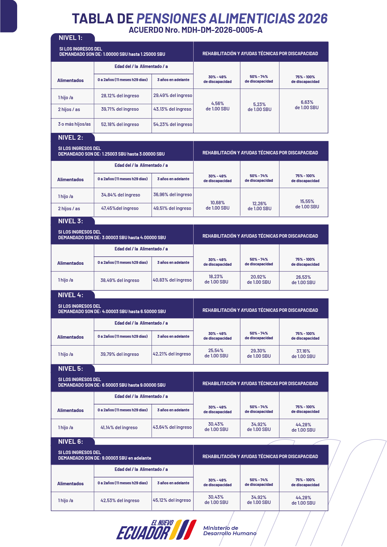 El Ministerio de Desarrollo Humano (MDH) de Ecuador oficializó la nueva Tabla de Pensiones Alimenticias para 2026. Mediante el Acuerdo Ministerial Nro. MDH-DM-2026-0005-A, se establecieron los montos mínimos que deben cumplirse para el bienestar de niñas, niños y adolescentes.