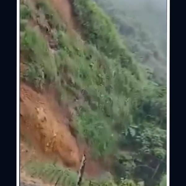 En las imágenes se observa el momento en que un talud de la montaña cede, provocando el desprendimiento de grandes volúmenes de tierra y rocas que se deslizan cuesta abajo, mientras varias personas realizaban labores de carga de material en el sector.