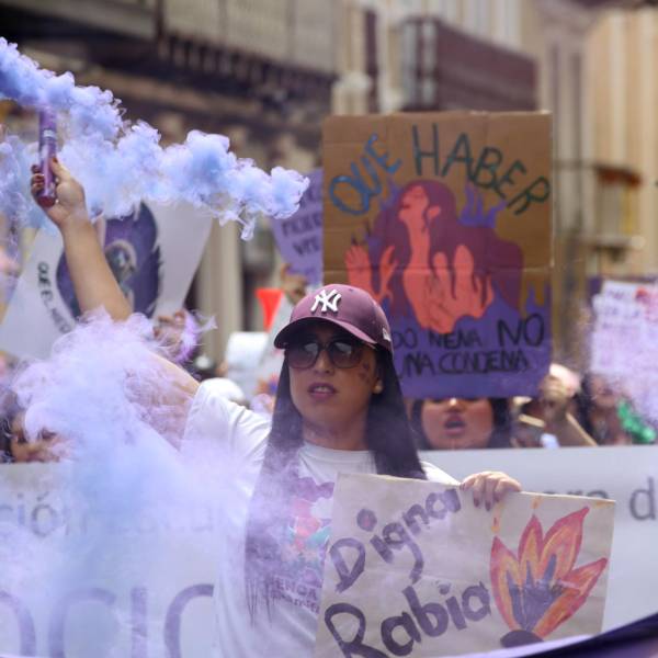 Mujeres, organizaciones sociales e incluso mascotas llegaron hasta la Plaza de Santo Domingo, donde las consignas fueron más fuertes. Ciudadanas gritaron por sus derechos y en contra de la violencia machista.