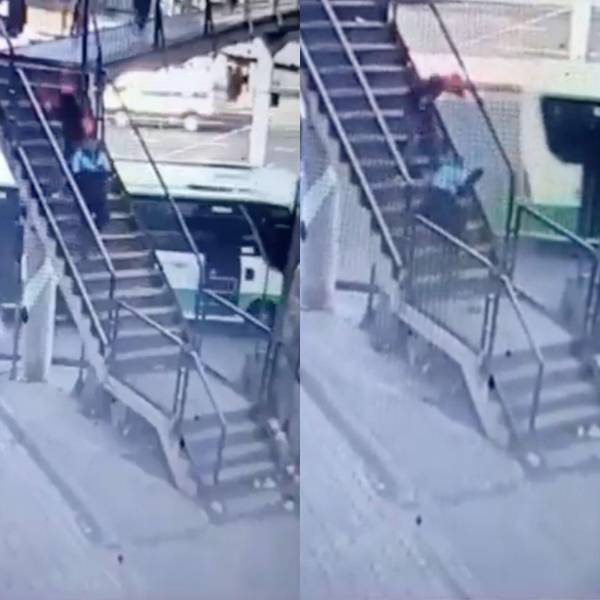 Sin embargo, el sospechoso saca lo que parecería ser un arma blanca y por la espalda empieza a apuñalar al servidor municipal, quien cae de las gradas y se muestra impotente ante las constantes agresiones.