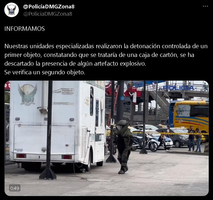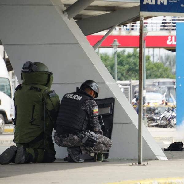 Una alerta de bomba se registró este martes 15 de agosto de 2023 en los exteriores de la Terminal Terrestre de Guayaquil. En el sitio se realizó la detonación de dos objetos sospechosos.