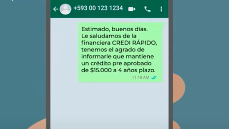Estas organizaciones usan diferentes métodos para captar dinero de manera ilegal. Por ejemplo, a través de WhatsApp con mensajes como este: “Estimado, buenos días. Le saludamos de la financiera CREDI RÁPIDO, tenemos el agrado de informarle que mantiene un crédito pre aprobado de 15.000 dólares a cuatro años plazo”,