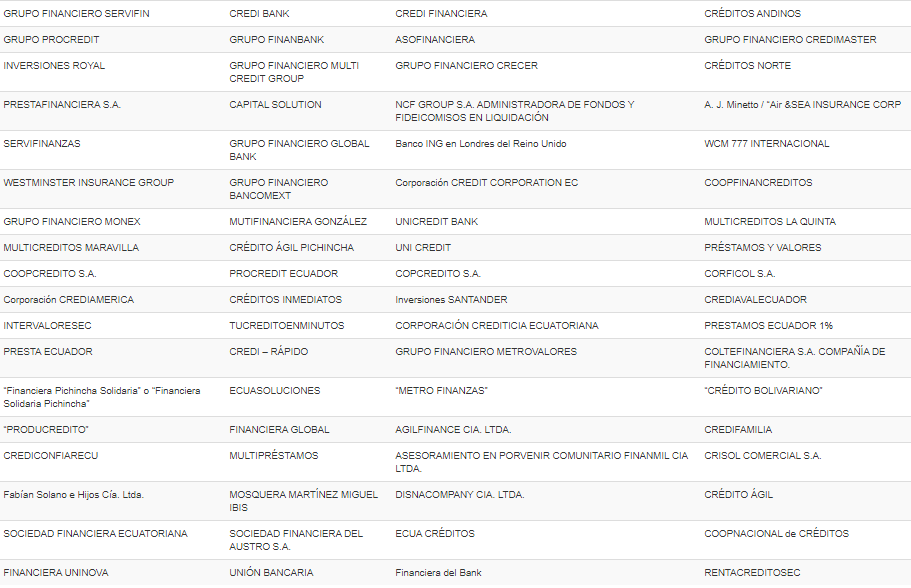 A continuación se detalla el nombre de las entidades no autorizadas a operar en el país: