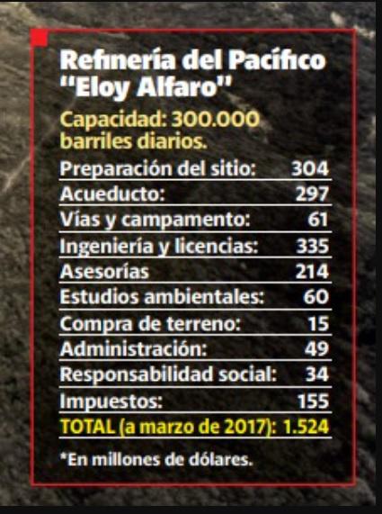 “Con las nuevas reservas encontradas y certificadas en el ITT –750 millones de barriles, 80 por ciento más de lo que creíamos que había– se vuelve aún mucho más urgente la Refinería del Pacífico, la inversión más grande dela historia del país que, además, tendrá complejo petroquímico”, aseguraba el expresidente Rafael Correa, en agosto de 2017.