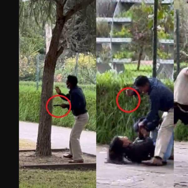 En las imágenes se observa al agresor sujetando un cuchillo y advirtiendo a las personas que no se acercaran, mientras la víctima está tendida en suelo, aparentemente herida, clamando ayuda y gritando desesperademente "auxilio".