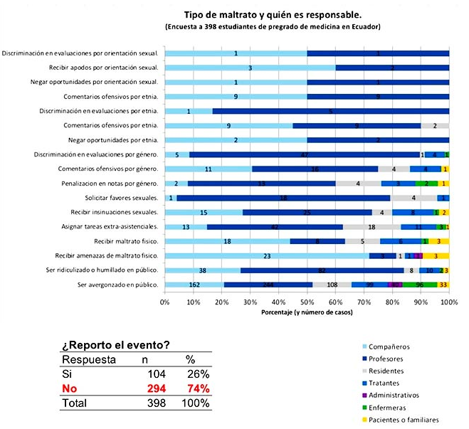 Encuesta sobre maltratos a estudiantes de medicina en Ecuador. Gráfico realizado por la investigadora Ana Lucía Martínez.