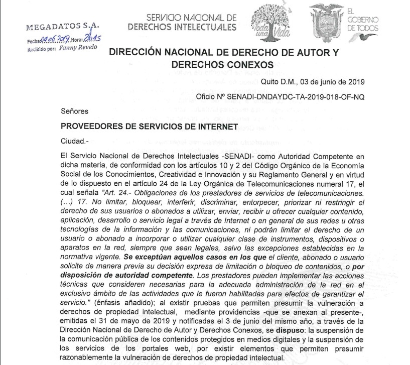 El martes 4 de junio a cerca de 500 proveedores de servicios de internet que operan en Ecuador fueron notificados por la SENADI sobre la disposición de bloquear estos sitios web.