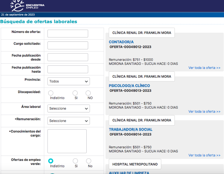Por ejemplo, hasta este jueves 21 de septiembre, se ofertan vacantes para una contadora, un psicólogo y una trabajadora social en una clínica de Morona Santiago.