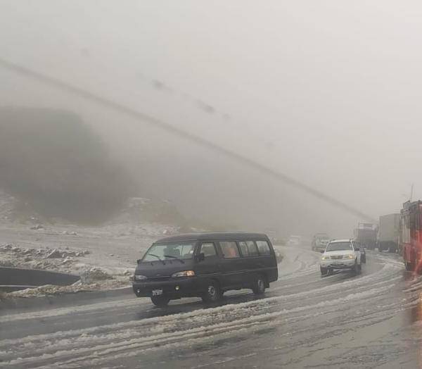 Varios vehículos quedaron atrapados por la caída de nieve registrada en el sector conocido como La Virgen de Papallacta, en Quijos, provincia del Napo, la mañana de este domingo 9 de julio de 2023.