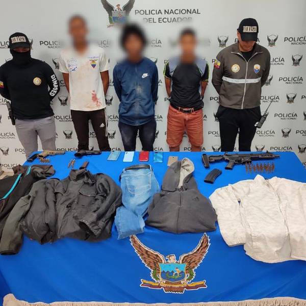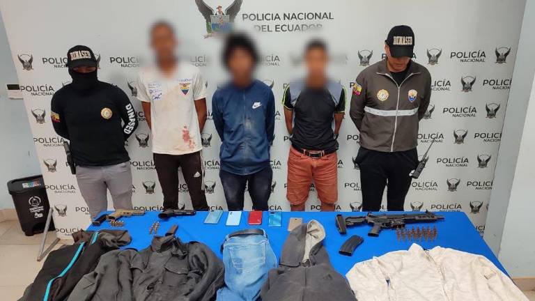 “En el poder de ellos se encontraron tres armas de fuego: un arma larga y dos pistolas 9 milímetros”, informó Julio Vásquez, jefe policial de la subzona Esmeraldas, en rueda de prensa.