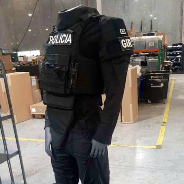 A través de X, el ministro Zapata compartió fotografías de los chalecos dentro de cajas que ya arribaron en Ecuador, en los cuales se podían observar las siglas del "Grupo de Intervención y Rescate (GIR)" de la Policía Nacional sobre el hombro izquierdo.