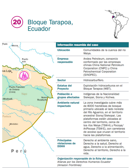 La operación de la petrolera Andes en Tarapoa está incluida en el informe presentado para el Cuarto Examen Periódico. Las actividades impactan en las comunidades de la cuenca del río Waiya, en las parroquias de Tarapioa, Cuyabeno y Aguas Negras, del cantón Cuyabeno. Indígenas de nacionalidades Siekopai, Siona y Kichwa viven los efectos, al igual que campesinos mestizos. Según el informe, la operación vulnera el derecho a un ambiente sano, a la salud, al agua, a la alimentación, al territorio y a la vida.