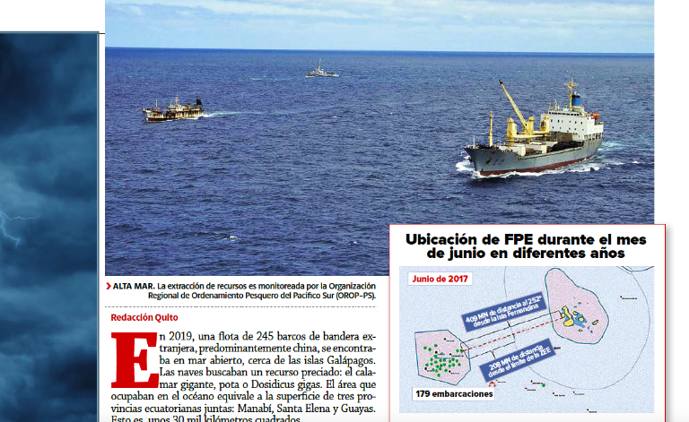 En 2019, una flota de 245 barcos de bandera extranjera, predominantemente china, se encontraba en mar abierto, cerca de las islas Galápagos. Las naves buscaban un recurso preciado: el calamar gigante, pota o Dosidicus gigas. El área que ocupaban en el océano equivale a la superficie de tres provincias ecuatorianas juntas: Manabí, Santa Elena y Guayas. Esto es, unos 30 mil kilómetros cuadrados.