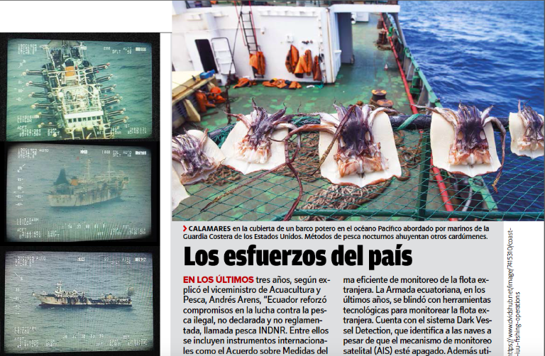 En 2019 un barco de bandera ecuatoriana fue detectado mientras abastecía de combustible, en alta mar, a la flota china. La investigación oficial concluyó que no hubo ilegalidad, porque el combustible fue adquirido en Panamá y no en Ecuador. Sin embargo, el debate público adquirió una dimensión ética, ya que la nave abastecedora pertenecía a un grupo económico relacionado con la familia de un ministro del gobierno de Lenín Moreno. ¿Es aceptable abastecer a una flota depredadora?