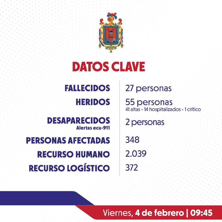 La cifra de muertos por el aluvión en Quito continúa incrementándose. Este viernes 4 de febrero de 2022, el COE Metropolitano informó que ascendieron a 27 los fallecidos, debido al fenómeno natural "extraordinario" que impactó fuertemente a los sectores de La Gasca, La Comuna y zonas aledañas.