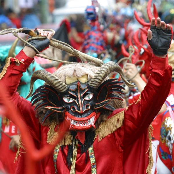 Cuernos en todas las direcciones suelen coronar máscaras de grandes colmillos, ojos saltones con miradas malévolas y grandes pelucas, que portan los danzantes vestidos de rojo y negro, mientras bailan por las calles de Píllaro, unos 150 kilómetros al sur de Quito, en la provincia de Tungurahua.