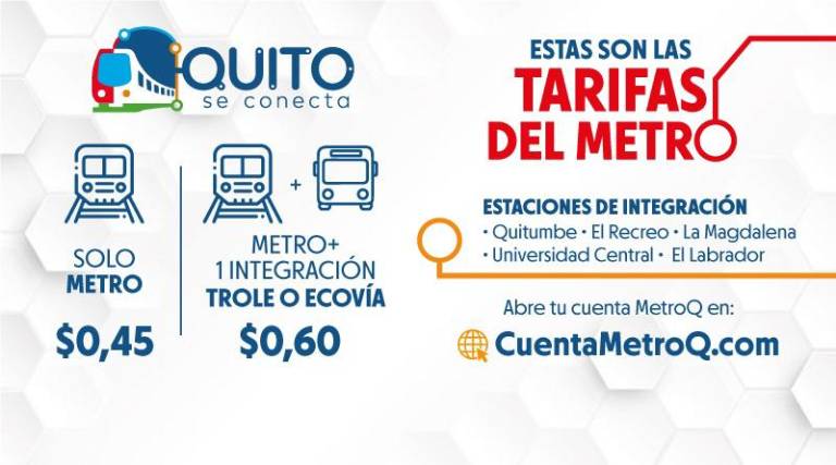 La ordenanza metropolitana establece la tarifa para el Metro de Quito de $ 0,45 centavos y la integrada con el Sistema de Transporte Municipal es de $ 0,60 centavos.