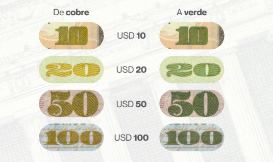 -Tinta que cambia de color: en la parte frontal de los billetes de USD 10, USD 20, USD 50 y USD 100, al observar el número ubicado en la esquina inferior derecha, se notará que este cambia de color cuando se inclina el billete hacia arriba y abajo.