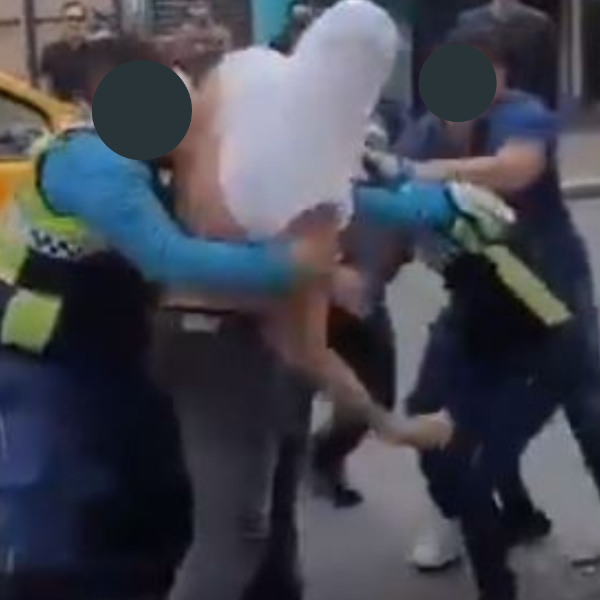 En la grabación se observa cómo el ciudadano empieza a reprochar a gritos a los uniformados que se movilizaban en bicicleta, toma la gorra que llevaba uno de ellos y lo empuja al suelo tras agarrarlo del cuello, mientras le decía que era un “malcriado”.