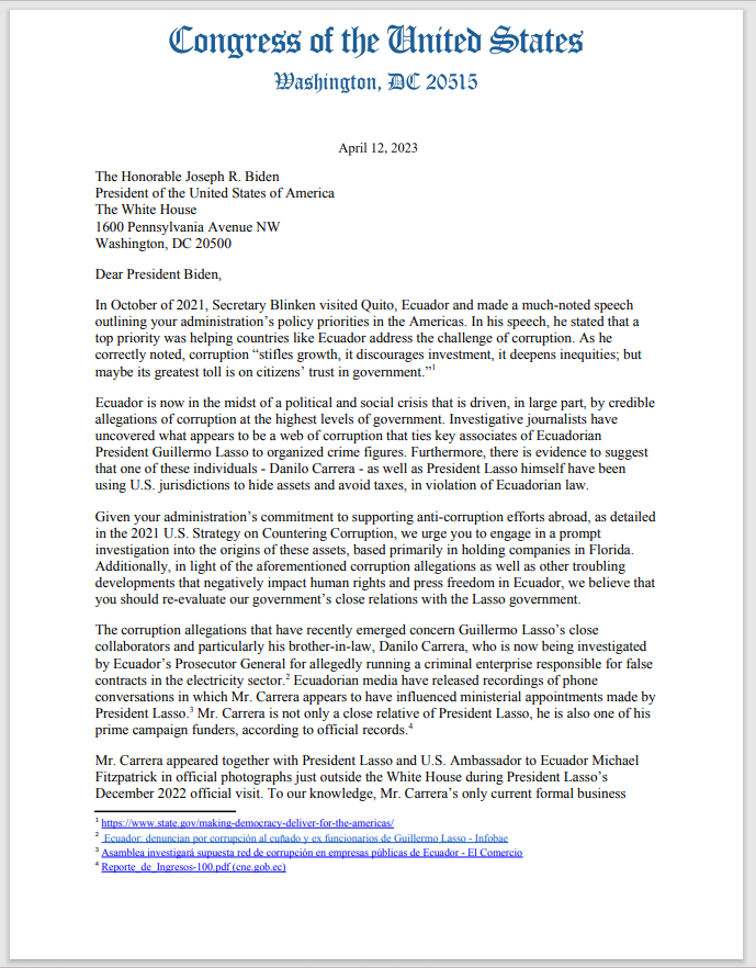 “Solicitamos respetuosamente que su administración investigue el asunto de los activos del presidente Guillermo Lasso y Danilo Carrera en los Estados Unidos y que las agencias estadounidenses pertinentes (...) investiguen lo más pronto posible los negocios del señor Carrera en nuestro país”, expresaron los congresistas.
