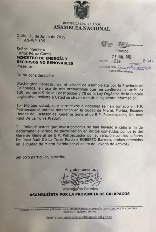 Tras conocerse la información, el asambleísta Washington Paredes pidió información al respecto, al ministro de Energía y Recursos No Renovables, Carlos Pérez.