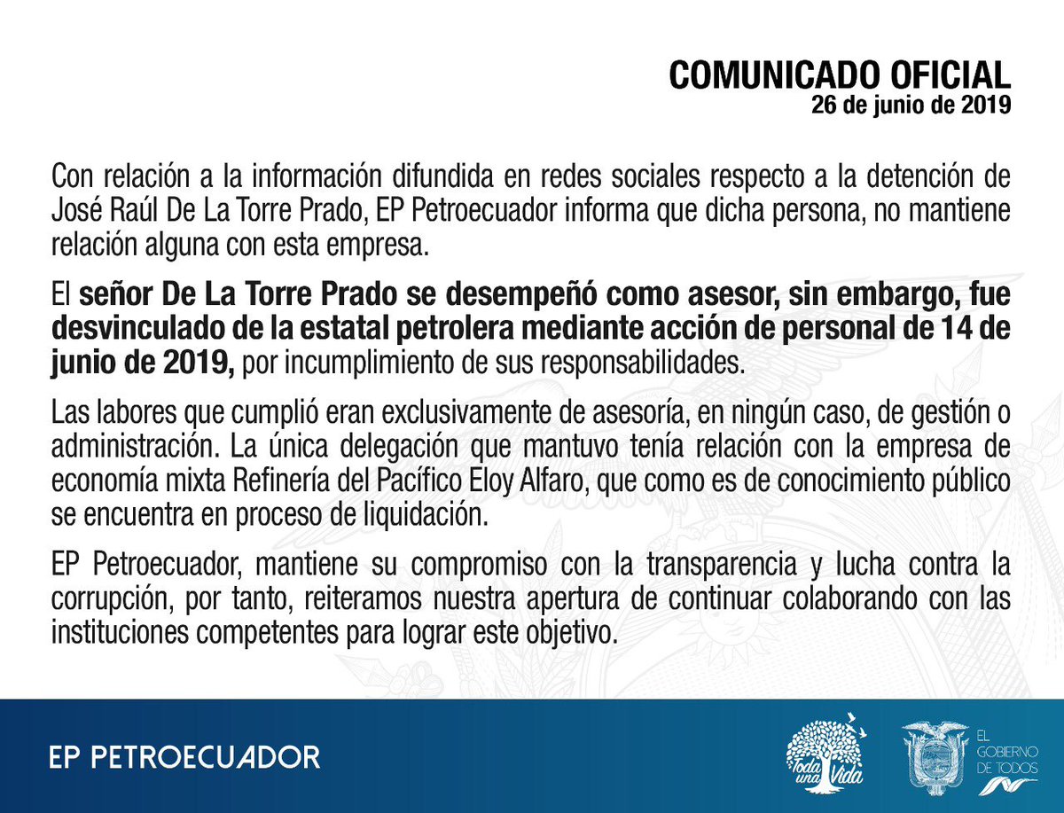 Después de la detención de José Raúl de la Torre Prado en Miami, Petroecuador se pronunció ayer a través de un comunicado asegurando que el exasesor fue desvinculado de la empresa estatal el 14 de junio de 2019, “por incumplimiento de sus responsabilidades”. Ese mismo día fue arrestado por llevar 250.000 dólares en un maletín cuya pro cedencia no pudo justificar.