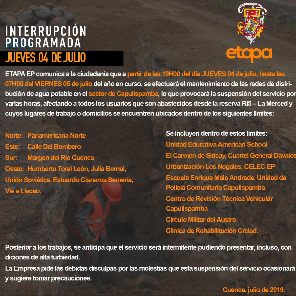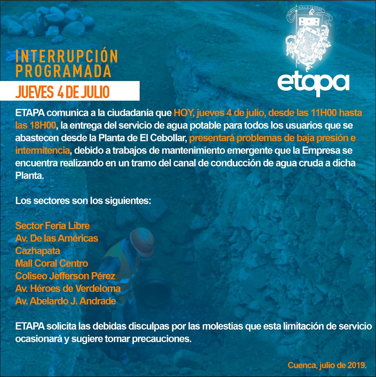 La empresa Empresa de Telecomunicaciones, Agua Potable, Alcantarillado y saneamiento de Cuenca, ETAPA EP, informó que este 4 de julio de 2019, el servicio de agua potable ha sido suspendido en varios sectores de la ciudad.