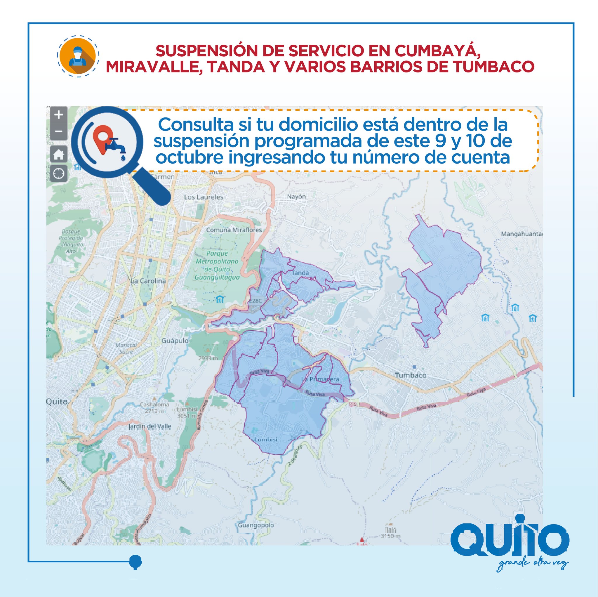 La Empresa Pública Metropolitana de Agua Potable y Saneamiento (Epmaps) informó que suspenderá el servicio de agua potable en 39 barrios de los valles de Cumbayá, Miravalle, Tanda y de Tumbaco, al nororiente de Quito.