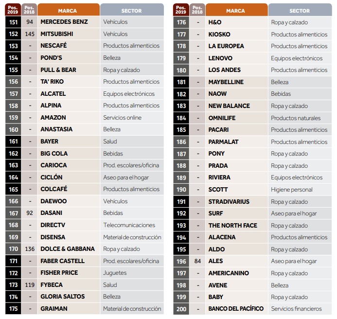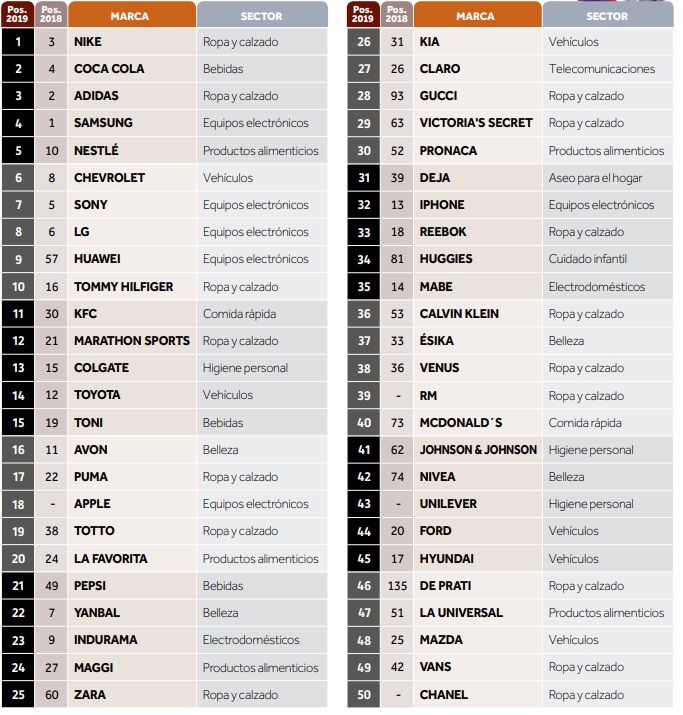 En lo individual, las marcas de origen multinacional imponen su huella en el mercado, tanto en segmentos deportivos, tecnológicos y de consumo masivo. Mientras las nacionales de mejor recordación son Marathon Sports, Toni y La Favorita.