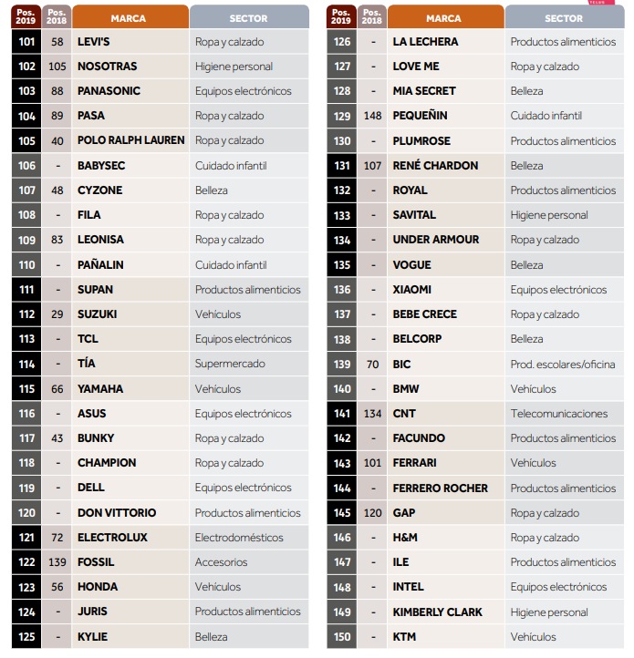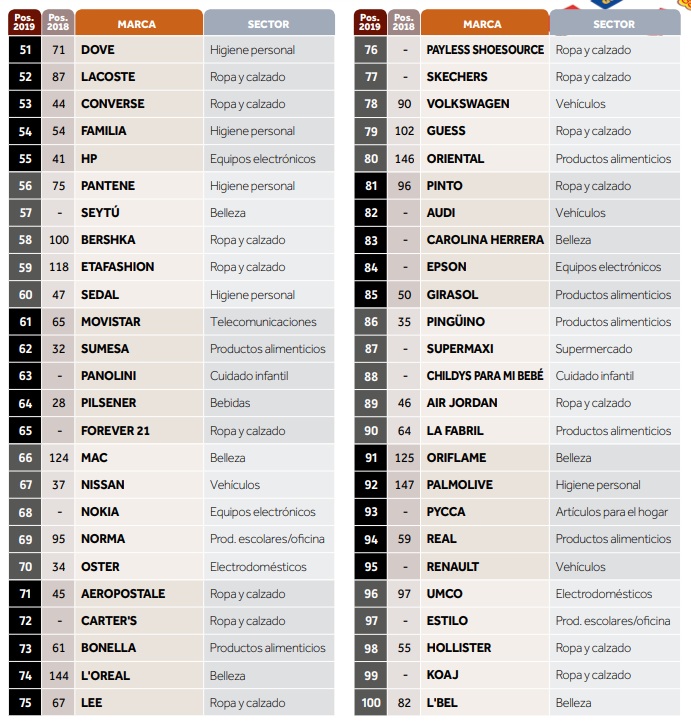 Categorías como Ropa y Calzado, Productos Alimenticios y Belleza, destacan en este ranking con más de la mitad de las marcas que aparecen.