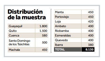 La muestra para esta investigación consta de 8.130 personas, con un margen de error +/- 1%. El método de muestreo es aleatorio en función de disponibilidad de teléfono fijo y móvil.