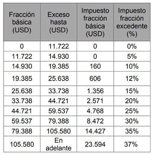 Para calcular el impuesto a la renta se restará, de la totalidad de los ingresos gravados, las devoluciones, descuentos, costos, gastos y deducciones atribuibles a esos ingresos. A este resultado se debe aplicar la tabla que se detalla a continuación: