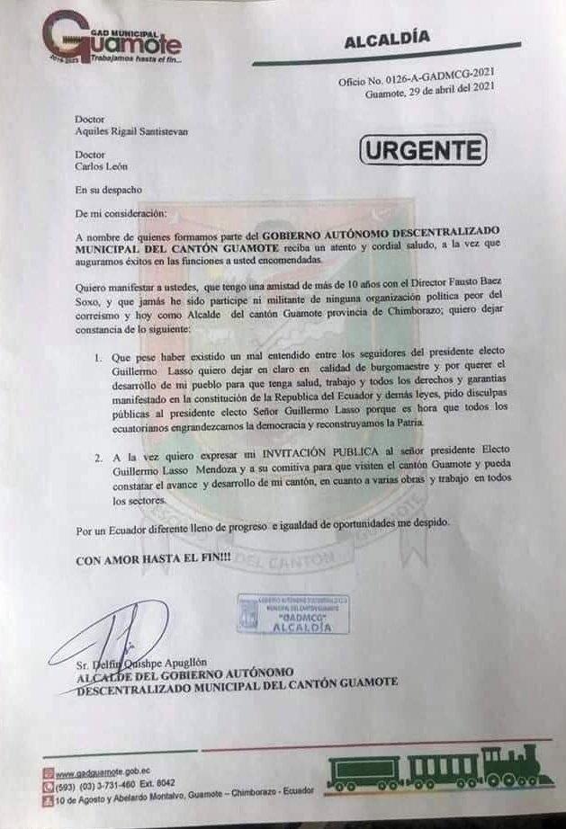 Asimismo, difundió una carta oficial de la alcaldía de Guamote en la que exhortaba al presidente electo y a su comitiva, a pasar por el cantón para que constate el avance y desarrollo de las obras y trabajos de la zona.