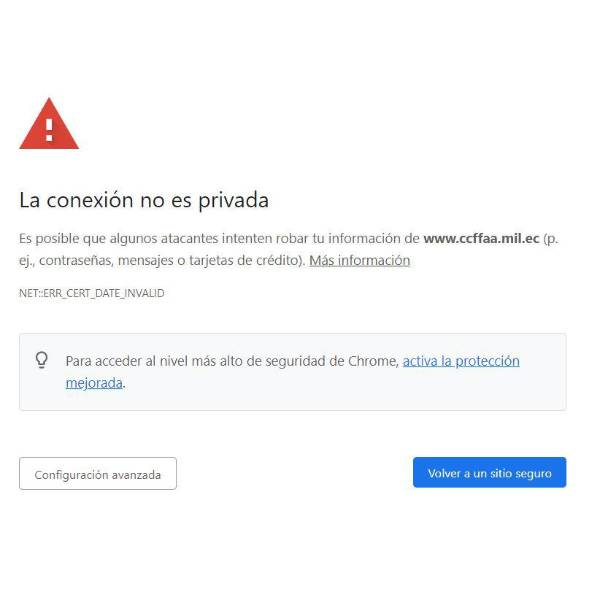 Actualmente, en el sitio web www.ccffaa.mil.ec solo aparece un aviso que informa sobre un error e indica que la conexión no es privada. "Es posible que algunos atacantes intenten robar tu información", dice el aviso.