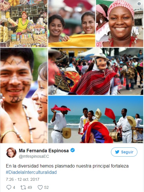 Varios funcionarios e instituciones del Estado publicaron sus mensajes en conmemoración de este día. La canciller de la República, María Fernanda Espinosa, escribió en su cuenta de Twitter: “En la diversidad hemos plasmado nuestra principal fortaleza”.