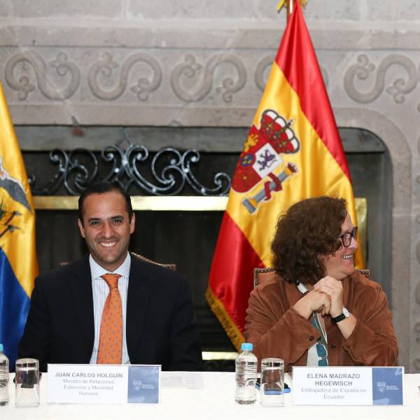 Además de Holguín, en el acto también participaron el secretario general del Tesoro y Financiación Internacional del Gobierno de España, Carlos Cuerpo, y la embajadora de España en Ecuador, Elena Madrazo.